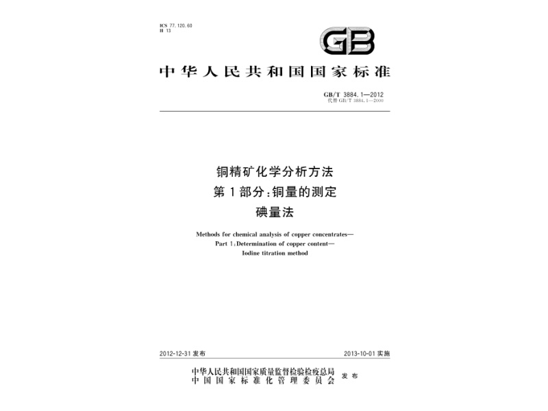 样品经盐酸、硝酸分解后,用乙酸铵溶液调节 溶液pH 3.0 ~ 4.0,用氟化氢铵掩蔽铁,加入碘化 钾与二价铜,析出的碘以淀粉为指示剂,用硫代 硫酸钠标准溶液滴定溶液滴定,硫代硫酸钠溶液 将碘还原,从而确定碘的含量,并通过计算得到 铜的含量。